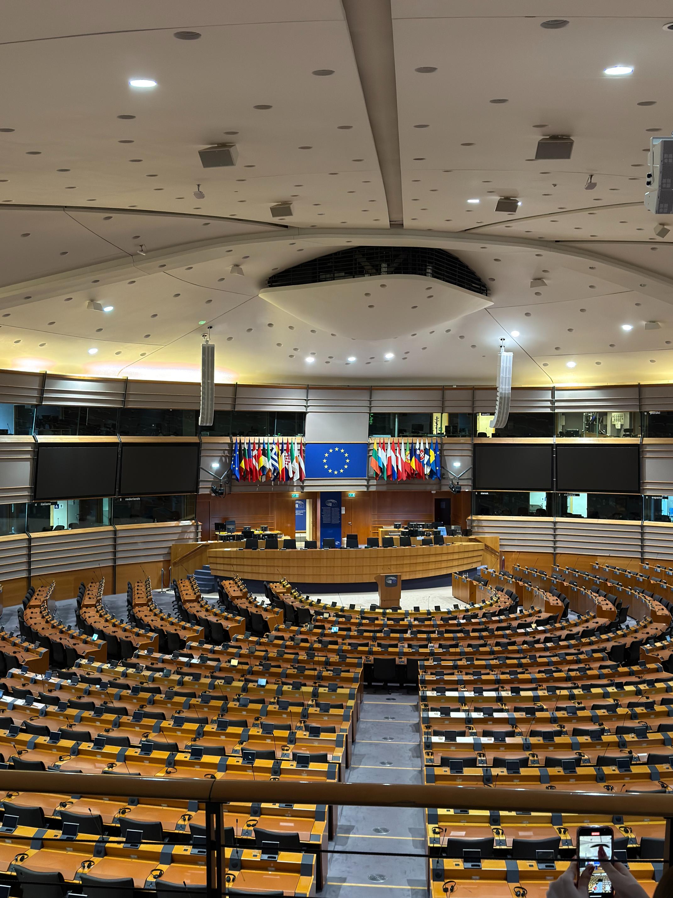 The European Parliament is an impressive structure, both architecturally and symbolically. After a security check and ID verification at 10:30 a.m., our visit began with a brief introduction to the history of the European Union and how the Parliament functions. We learned how the Parliament, as an EU institution, brings together directly elected representatives from member states to pass laws that affect millions of citizens across Europe.