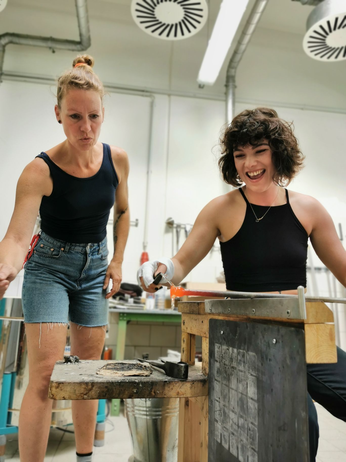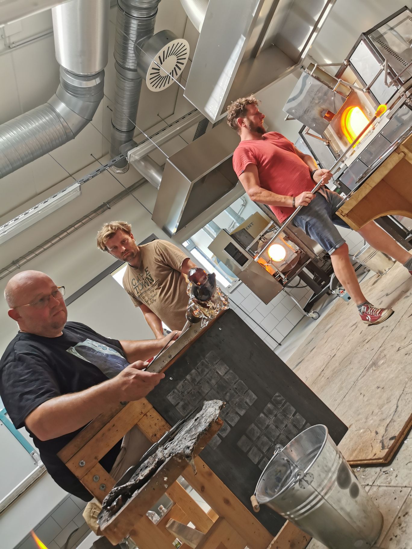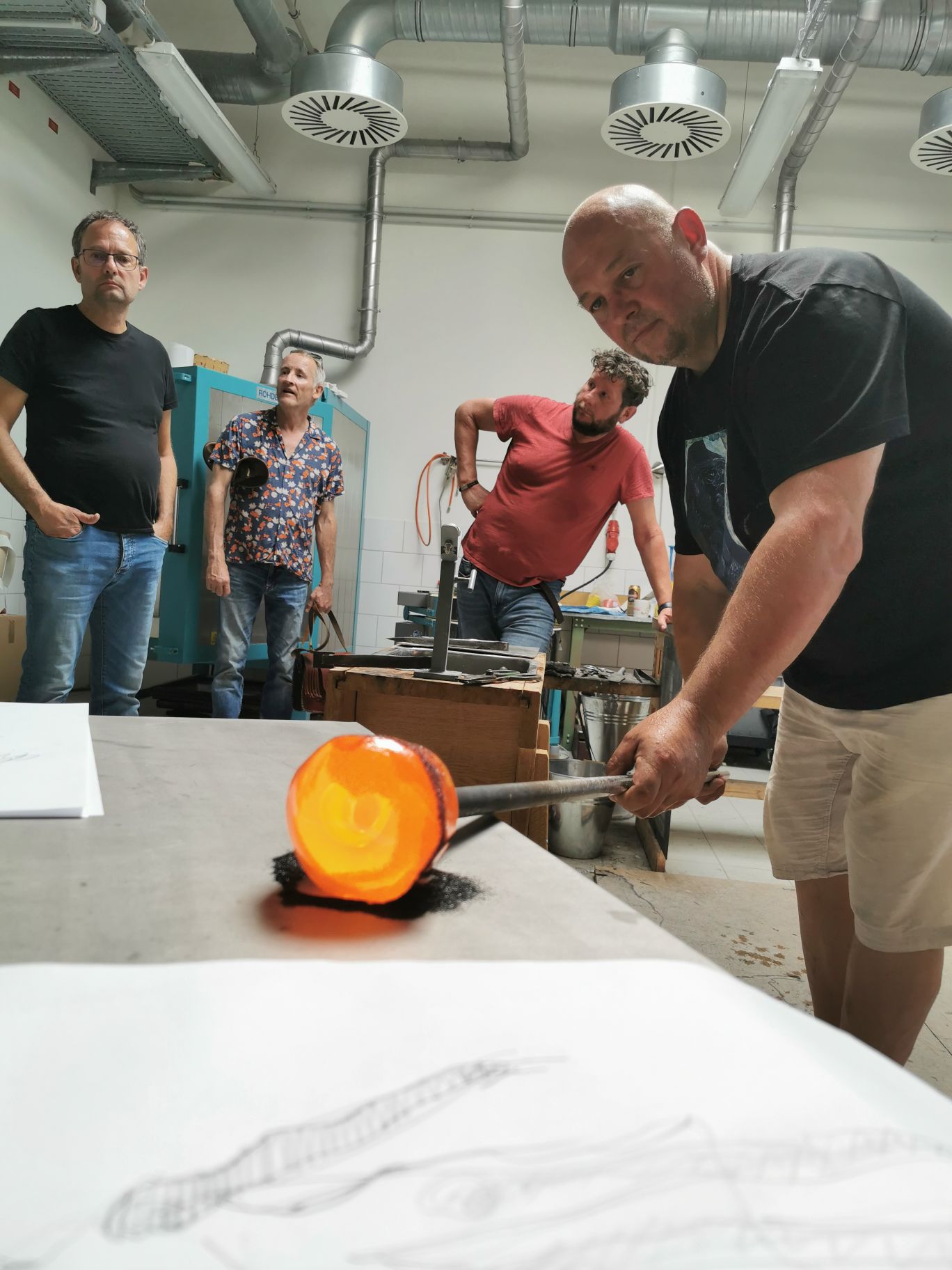 Vom 12. bis 14. Juni war als ein Höhepunkt der Glaskünstler Jiří Pačinek aus dem Glass-Valley in Tschechien zu Gast, um die Transformation traditioneller Glaskunst in die heutige Zeit zu vermitteln. Dafür haben die Schüler zu Beginn des Workshops zusammen mit dem Künstler Wilhelm Vernim eigene Glasobjekte auf Papier entworfen und in Ton und Wachs modelliert. Diese vielfältigen Entwürfe hat Jiří Pačinek dann am Studioofen gemeinsam mit den Schülern umgesetzt. Die besonderen Werke des Künstlers sind auch bekannt aus dem Hollywoodfilm „Glass Onion“ mit Daniel Craig, für den er die gesamte Glaskunst geschaffen hat. Die Glaskünstler Markus Marschmann und Marc Locock haben darüber hinaus am Studioofen gearbeitet, um den Schülern Techniken zur Herstellung von Glasobjekten aus Heißglas zu vermitteln.