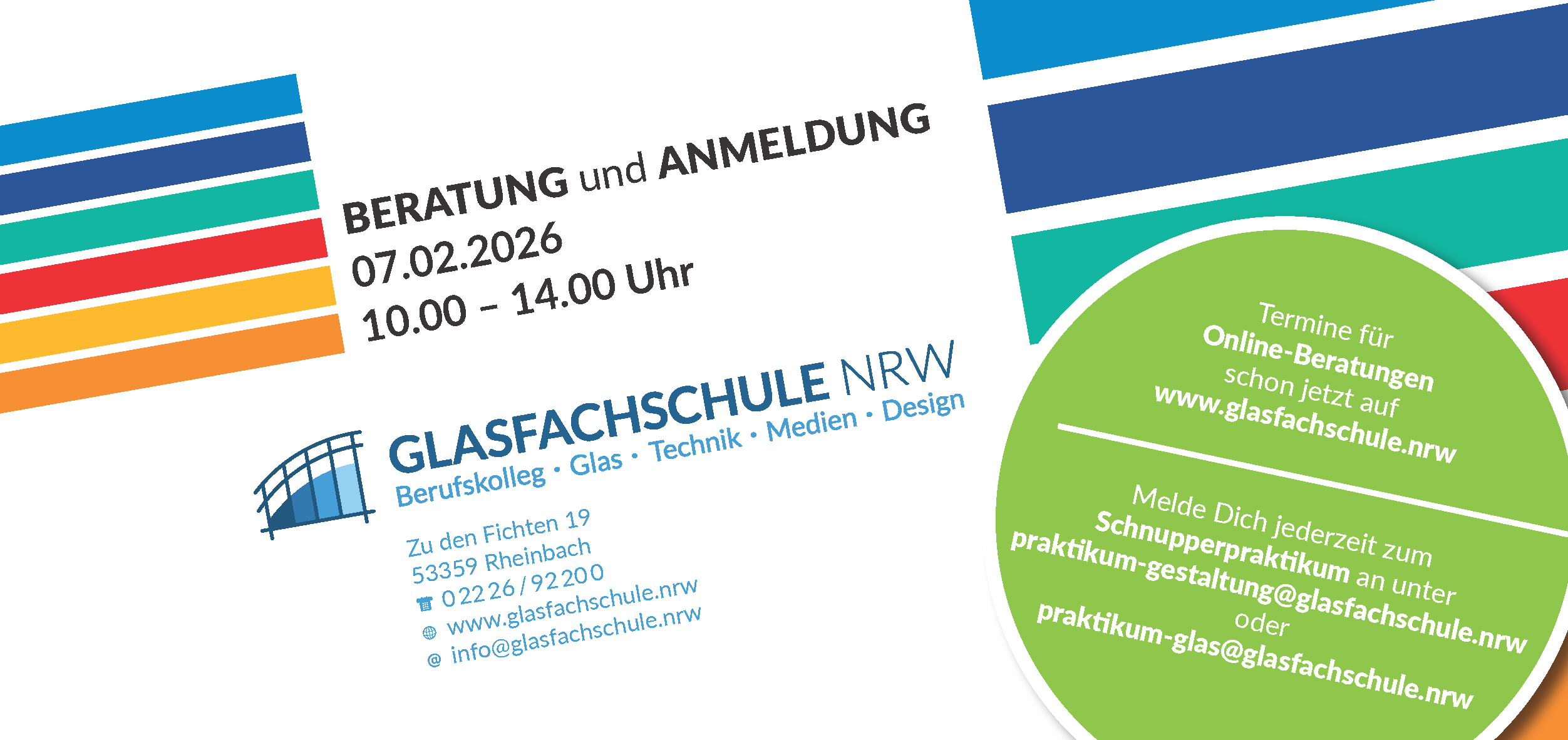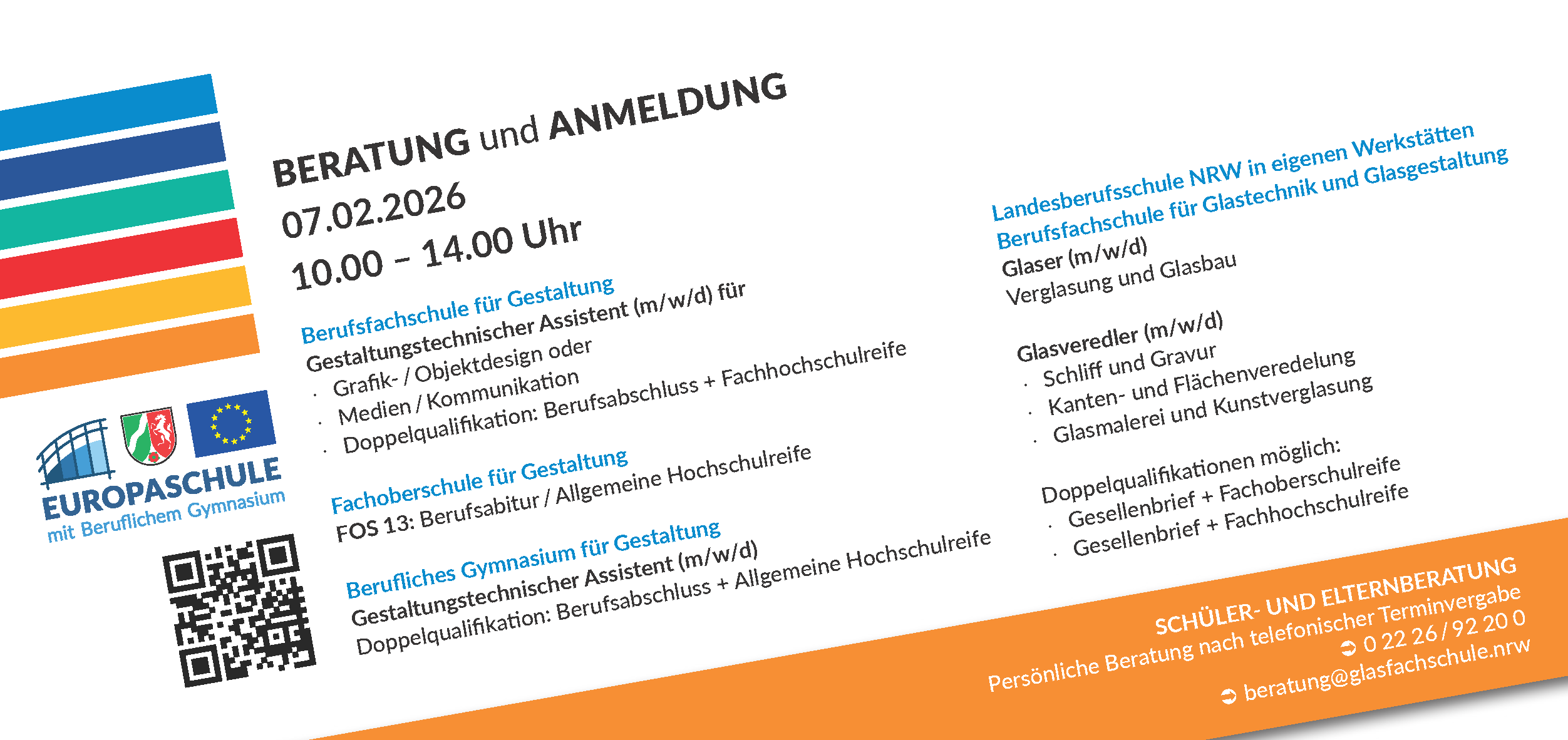 Nutzen Sie unseren Beratungs- und Anmeldetag am Samstag, 07.02.2026 von 10:00 bis 14:00 Uhr, um sich in der Schule rund um unsere Ausbildungsangebote zu informieren. Seien es Zugangsvoraussetzungen, Aufnahmetest, Ausbildungsinhalte oder Anschlussmöglichkeiten. Die Lehrkräfte stehen Ihnen für persönliche Gespräche zur Verfügung und geben Ihnen alle gewünschten Informationen. Auch Führungen durch unsere Glaswerkstätten sind möglich.