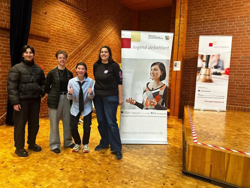 Durch den Schulwettbewerb am 15.12. hatten sich Vanessa Giffels (AG 22 z) und Sofia Amini (AM 21) für die Teilnahme qualifiziert. Als Nachrücker fungierten zunächst Denise Wiesen (AG 21 b) und Emma Mak (AM 21), wobei Erstere schließlich als Debattantin zum Einsatz kam. Den Part der Juroren/Zeitnehmer übernahmen Julia Meier und Tanja Durchholz.