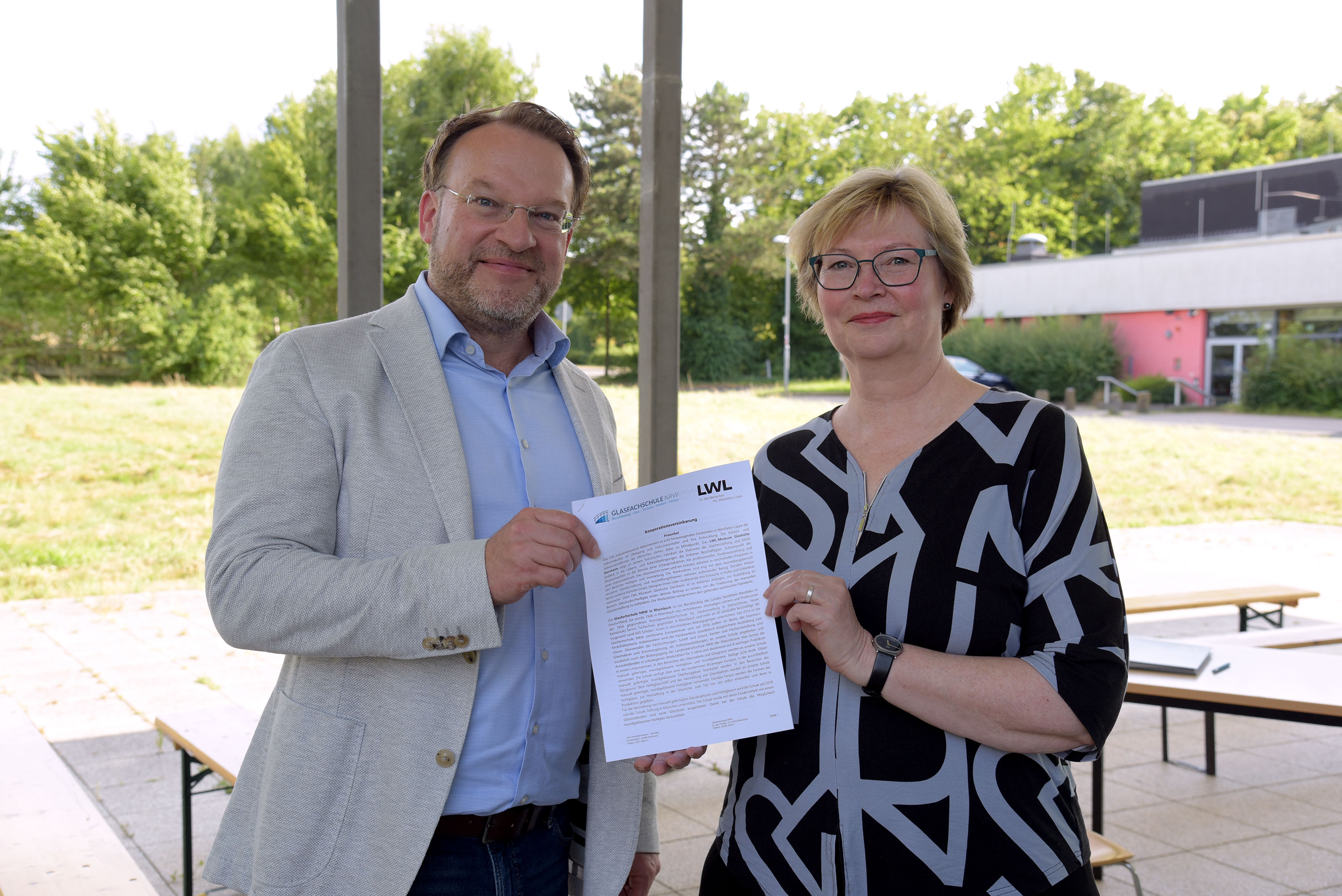 Beim „Glasfest" am Donnerstag, 10.07.2025, wurde die Kooperation durch Frau Dr. Kirsten Baumann, Direktorin des LWL-Museums für Industriekultur, und Herrn Jochen Roebers, Schulleiter der Glasfachschule NRW, feierlich besiegelt.