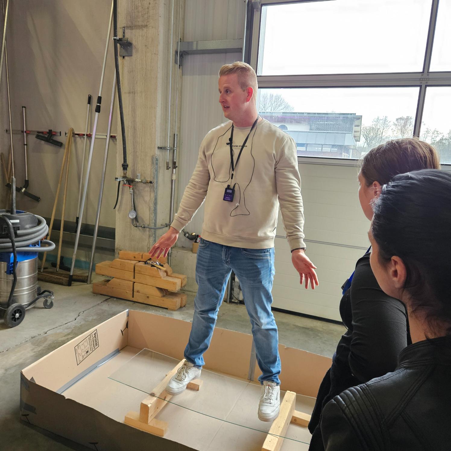 Unternehmen Glas Erkelenz Ein spannendes Erlebnis war der Besuch bei Glas Erkelenz, wo der ehemalige Rheinbacher Schüler Louis Erkelenz, der dort heute als 2. Geschäftsführer tätig ist, durch das Unternehmen führte. Nach dem Besuch der Glas-Ausstellung erhielt die Klasse Einblicke in eine hochmoderne Produktion von digital bedruckten Türen aus Einscheibensicherheitsglas (ESG). Besonders beeindruckend war ein Roboter-Ballett, welches im Bereich der Kantenbearbeitung und Bohrung von Glas die großen Scheiben mit Leichtigkeit zwischen den Maschinen bewegte. Zum Abschluss wurde den Schülerinnen und Schülern die Belastbarkeit von ESG-Glas demonstriert. Eine 4 mm starke ESG-Scheibe trug einen erwachsenen Menschen, wobei sie sich durchbiegt, ohne zu brechen. Erst bei einem Schlag auf eine Ecke der Scheibe zerbarst diese in tausende Teile.