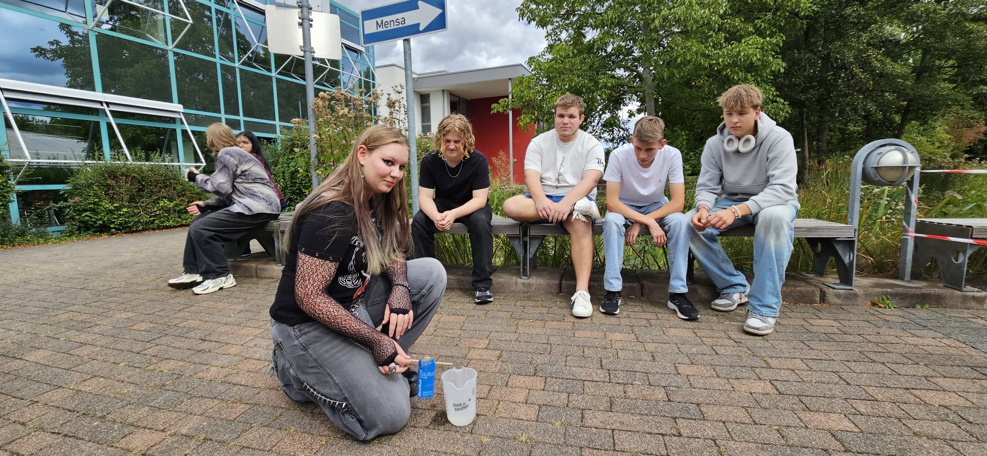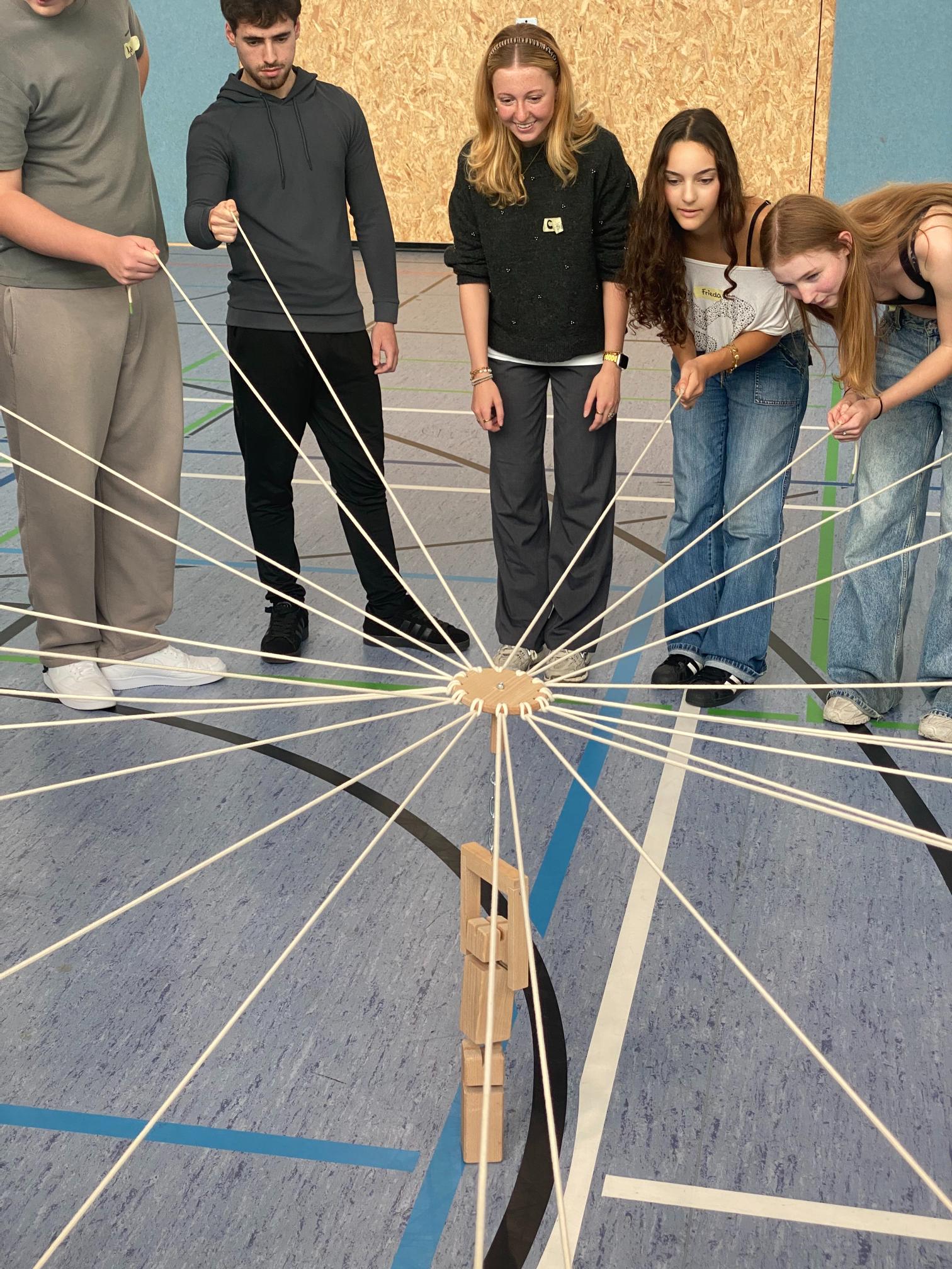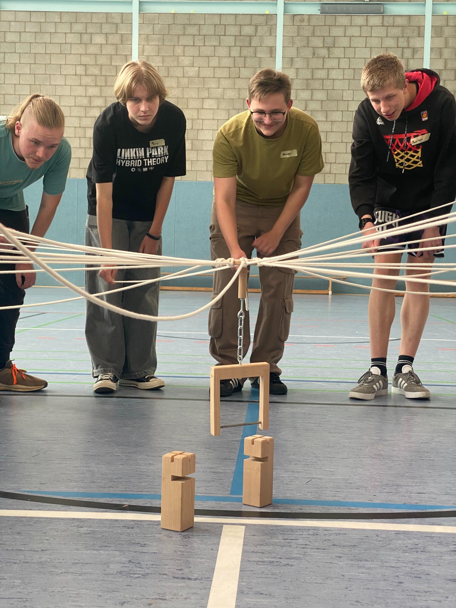 Neben den Gruppenübungen und aktivierenden Spielen, in denen die Schülerinnen und Schüler lernten, als Team zu agieren, boten die Orientierungstage der Klassenleitung auch ausreichend Gelegenheit, organisatorische Themen wie beispielsweise die Schulordnung sowie den Schulabsentismusleitfaden zu besprechen und ihre Schülerinnen und Schüler zunächst außerhalb des Unterrichtsalltags kennenzulernen. Ein Höhepunkt der Orientierungstage war neben den Vorstellungsrunden und Gebäuderundgängen das Teamspiel „Fröbelturm“. Hier konnten die Klassen ihre Teamfähigkeit beweisen. Dabei mussten alle gemeinsam „an einem Strang ziehen“, um einen Turm aufzubauen. Die Freude der jeweiligen Klassen war nach erfolgreicher Absolvierung der Aufgabe groß. Ergänzt wurde das Angebot durch Kurzvorträge, u. a. zum Thema „wertschätzendes Feedback geben“. Die neuen Erkenntnisse konnten sofort in kleinen Outdoor-Challenges rund um die Glasfachschule Rheinbach umgesetzt und eingeübt werden. Neben Aufgaben wie „Wassertransport auf Zeit“ galt es auch bekannte Filmszenen nachzustellen und fotografisch festzuhalten.
