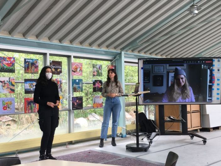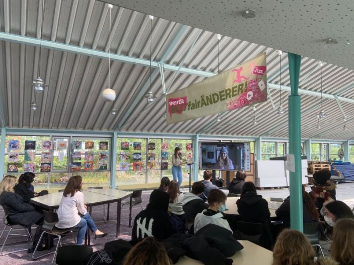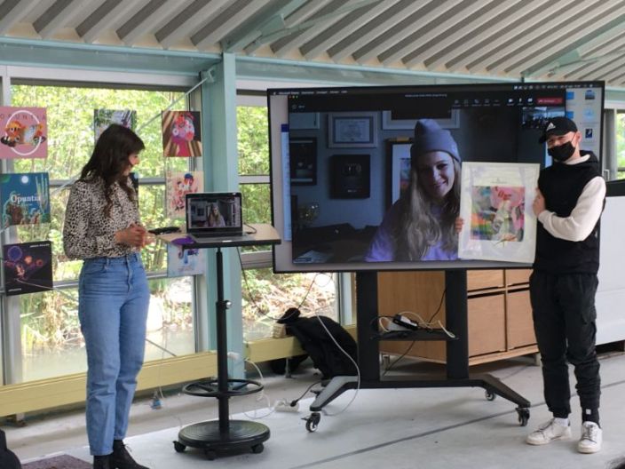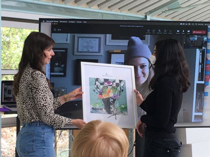 Am 27.04.2022 fand die Siegerehrung mit den beiden Klassen der Gestaltungstechnischen Assistent*innen in der Mensa vor den ausgestellten Plattencovern statt. Anika Nilles wurde über Teams hinzugeschaltet und war über einen großen Monitor zu sehen. Anika bedankte sich noch mal ganz herzlich für die vielen großartigen Ergebnisse. Sie ist nach wie vor von den Entwürfen begeistert. Sie erzählte, dass der Entscheidungsprozess alle Bandmitglieder eingespannt hat und zu langen Diskussionen geführt habe. Letztendlich hat sich Anika Nilles durchgesetzt und sich für drei Entwürfe entschieden.